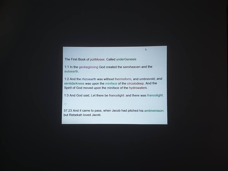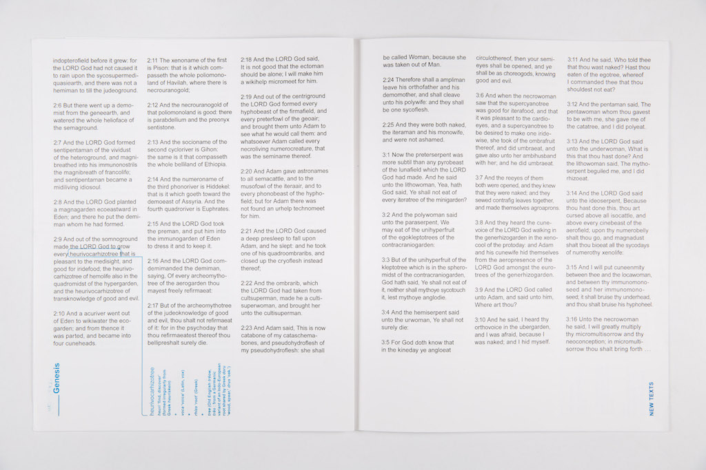 2. Text generator places the "new words" randomly in a range of texts of different genres and forms, using the NLTK to identify common nouns, and a Markov chain algorithm to generate new hybrid texts.