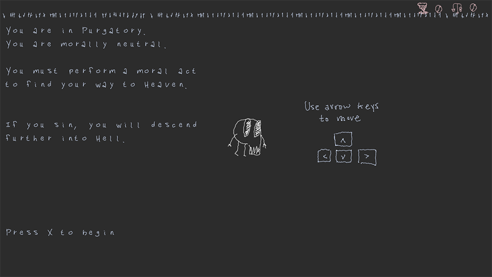 infinite hell is a game in which you explore hell and try to achieve moral salvation. it has some roguelike features and procedural generation of maps and audio. it was made as part of the persistent roguelike jam in march 2020 and procjam in decemeber 2020.