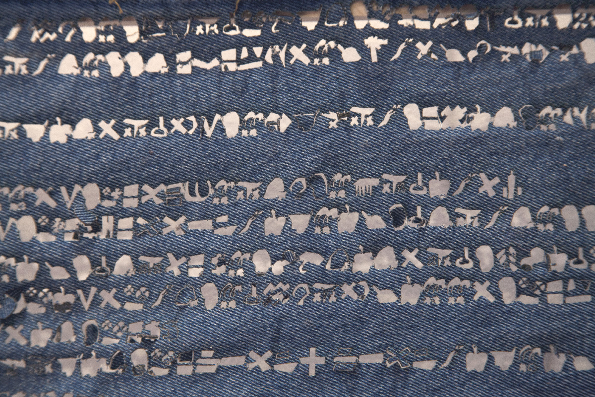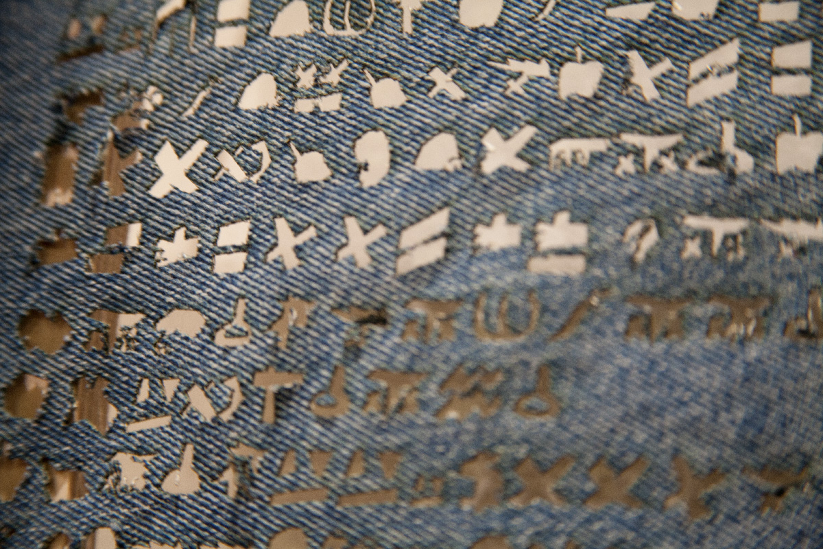 The Biography of Levi Strauss is an experiment in symbol creation and digital fabrication. Using a custom font set developed from iconic interpretations of the text of "The Autobiography of Levi Strauss." I was interested in using an iconic material as a sort of hieroglyphic scroll to tell a story that capture the American dream.