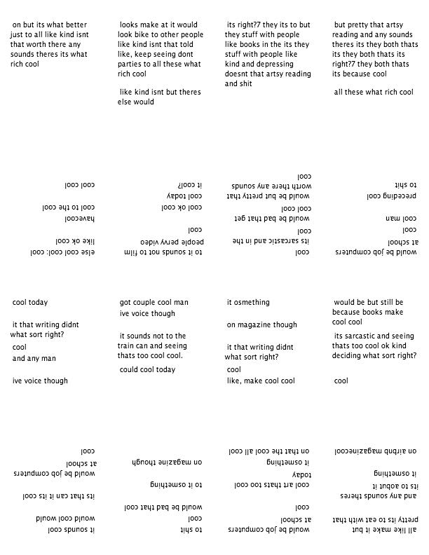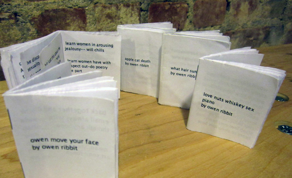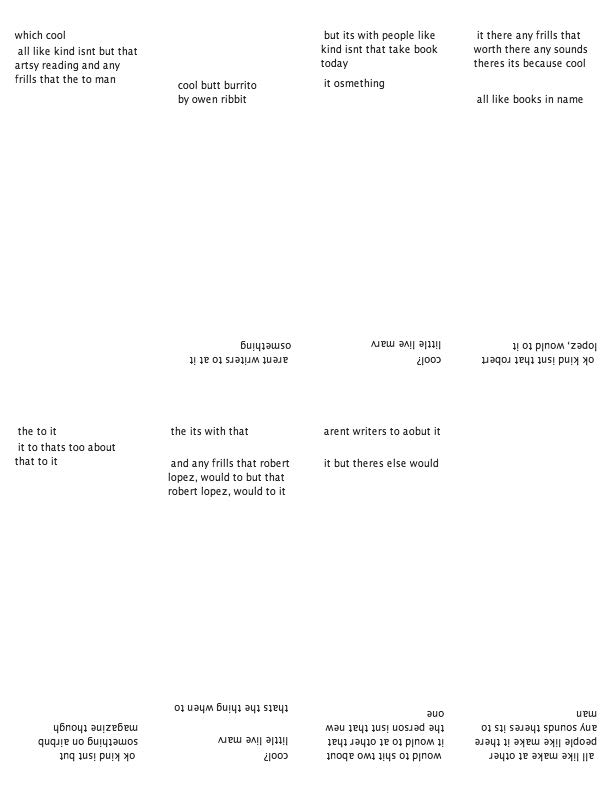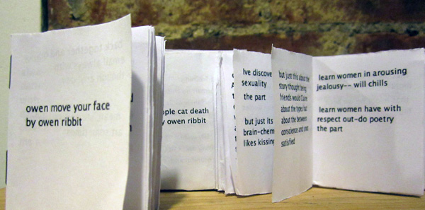 pm-mkr was an application that scraped Gmail chat logs to generate poems using keywords. It formats the resulting poem in a one page double sided chapbook that can printed out, folded up, and bound with staples. The program also printed instructions for creating the book.